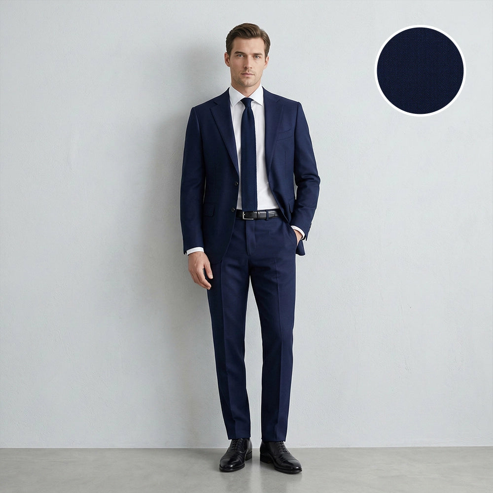 Our fabric range covers every occasion and climate, sourced from leading mills including Vitale Barberis Canonico (VBC), Guabello, Ermenegildo Zegna, Loro Piana, Angelico, Liberty, Maurizo, Vito, and MB Sartorial. During your consultation, we recommend the right cloth for your needs, from Italian worsted wools (Super 110’s to 160’s) and superfine merino (120’s, 130’s, 150’s, plus ultra-fine 15 micron options) to natural-stretch performance wool, tropical and four-season weaves, Lycra stretch suiting, and breathable luxury linen, so your bespoke suit matches your season, occasion, and comfort preferences.