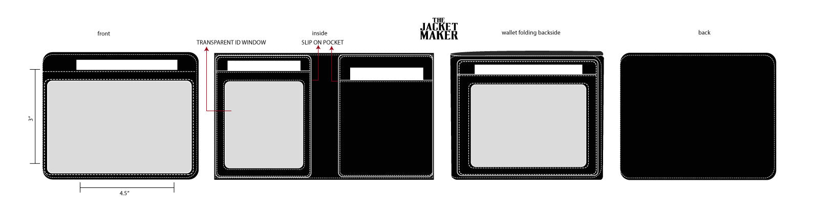 • One large transparent ID window on the front of the wallet when folded (as per references & mock)